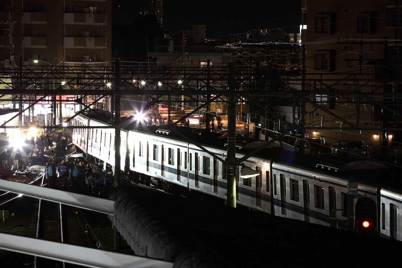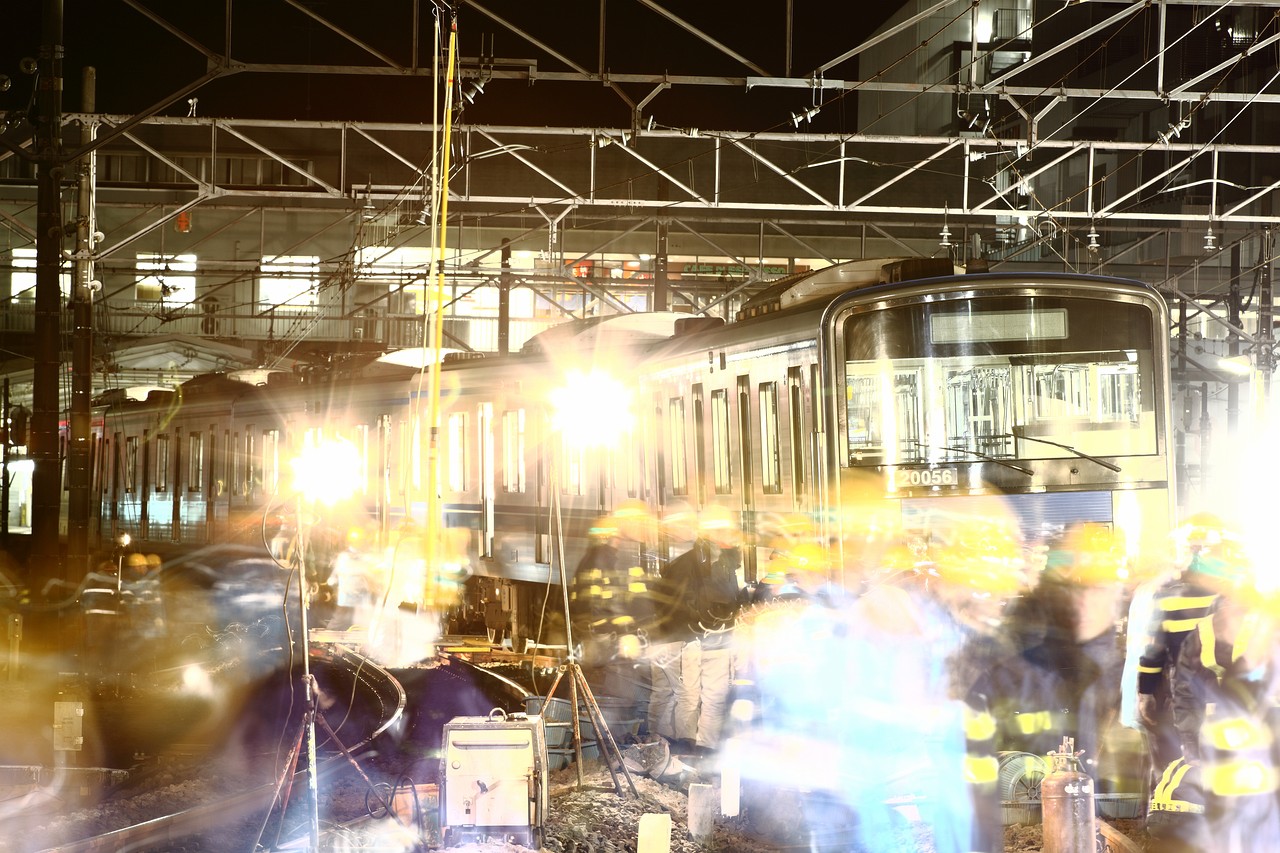 脱線現場は赤々と照明で照らされ、作業員らが夜通しで復旧作業に当たっていた。